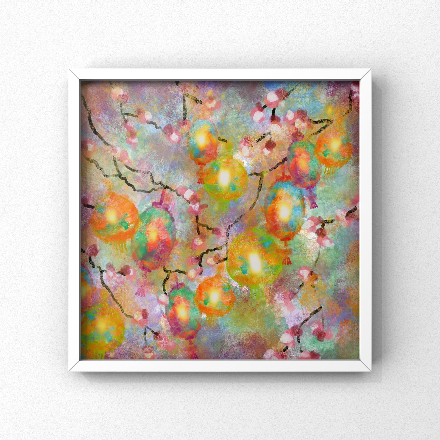 THE LANTERN FESTIVAL WAS THE INSPIRATION BEHIND THIS PIECE. A CANDLE SET INSIDE EXUDES A SOFT GLOW WHEREBY THE PAPER PATTERNS DANCE IN THE MOONLIGHT. A PAINTING TO BRIGHTEN ANY SPACE.